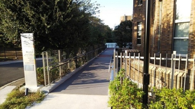 *中央エントランスまで、スロープを設置 *施設内の段差を解消するため、段差解消機を設置